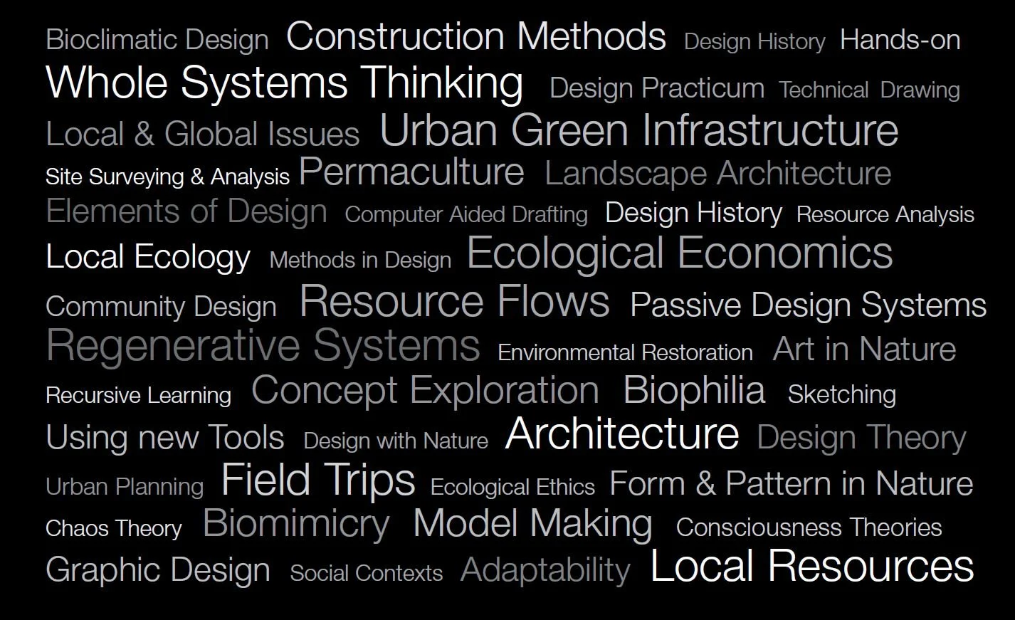 These presentations and discussions form the knowledge base of the certificate program. Subjects range from sketching and drawing to more conceptual ideas including regenerative design and systems thinking.
